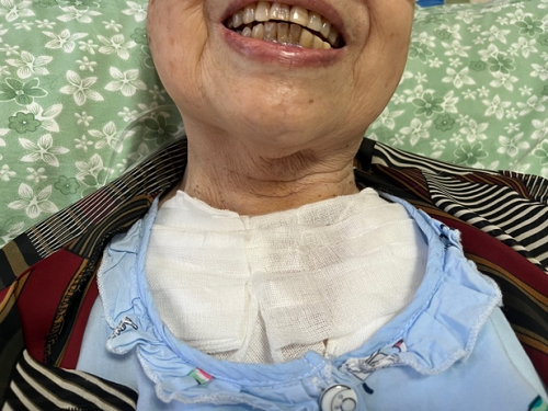 第三位患者为患86岁高龄女性,6月11日入院时颈部可扪及一约10*10cm大小肿物,伴呼吸压迫,具有明确手术指针。吴唯教授考虑该患者同时合并有冠心病、阿兹海默症、既往新冠白肺等一系列合并症,在接诊该患者后立即完善了全面检验检查。然而,困难却比想象更多。