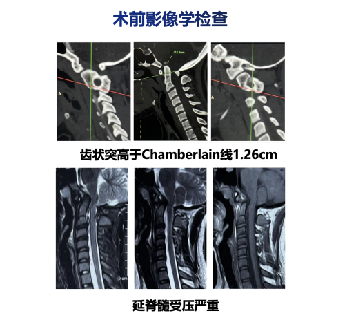 入院当天,湘雅三医院颅椎组组长、副主任医师李劲松接诊。经过详细的病史询问及体查,完善相关影像学检查后,明确诊断为:A型颅底凹陷症并寰枕融合、颈2-3融合畸形,建议手术治疗。脊柱外科组织全科专家进行病例讨论,医院脊柱外科主任邓幼文指出:“颅底凹陷症属于颅颈交界区常见畸形,表现为枢椎齿状突尖端突入颅内,是一种较为复杂的先天性病理状态。颅底凹陷症合并寰枢脱位,临床分型为A型。脱位后齿状突向后上进入枕大孔内,压迫延髓、脊髓或脑神经,造成感觉、运动、括约肌功能障碍,甚至导致病人死亡,是需要进行高难度、高风险的手术救治的疾病。”