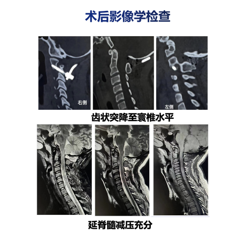 手术当日,由主任医师邓幼文、副主任医师李劲松、主治医师谭伟组成手术医师团队,在神经电生理监护下为小龙实施了“颅骨牵引下寰枢关节脱位开放复位+寰椎后弓切除减压+枕颈钉板系统内固定(C0-C3)+自体髂骨植骨融合术”。在邓幼文主任指导下,李劲松医师及手术团队凭借巧夺天工的技艺,实现了寰枢关节解剖复位,齿状突降至寰椎水平,圆满地完成了手术。术后3天,小龙就能自如下地行走,头晕、头痛、恶心呕吐的症状得到明显缓解,还惊喜地发现自己竟增高了2公分!小龙的父亲满含热泪:“感谢湘雅三医院脊柱外科,感谢邓主任,感谢李教授,感谢所有的医护人员”。
