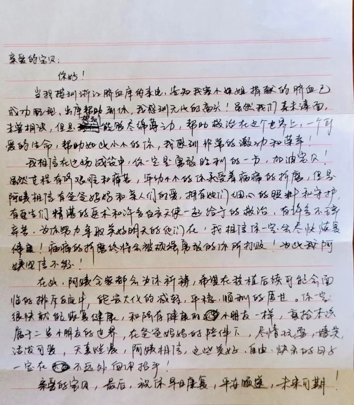 日前,浙江省脐血库的工作人员专程赶往中南大学湘雅三医院,将一封供者对患儿表达鼓励与祝福的信件交到了患儿家属手中,正是这封信的主人捐献的“脐血种子”成功挽救了一位人生刚刚开始的小男孩的生命。