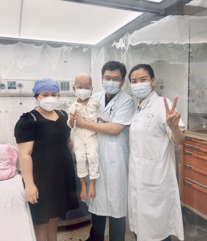 2岁的霖霖患有急性髓系白血病(AML),这是一种病情非常凶险的疾病,患儿的骨髓会产生大量不正常的白细胞,主要表现为发热、苍白、乏力、出血、关节疼痛等,若不及时治疗,病情恶化迅速。造血干细胞移植治疗是治疗中、高危AML的有效手段。脐血来源广泛,脐血干细胞免疫原性低,移植后患儿排斥反应发生率低,适合低体重儿童的移植需要,移植后免疫重建时间长,容易出现各种感染。在中南大学湘雅三医院儿科移植病房MDT团队的多次探讨下决定为霖霖实施非血缘脐血移植治疗AML。经科室医护人员的联络与对比,最终在浙江省脐血库找到了各项指数最匹配的脐带血,霖霖8月1日进入移植仓内行全环境保护性隔离,在移植团队的精心治疗和照护下获得造血重建,于9月19日康复出仓。该患儿为湘雅三医院儿科移植病房本年度完成的首例纯脐血造血干细胞移植,标志着医院在造血干细胞移植诊疗技术上的进一步提升与突破。
