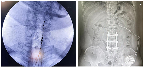 小谢收治住院后完善相关检查,诊断为“神经病理性疼痛:幻肢痛”。因小谢及家属对疼痛的治疗和缓解有着十分强烈的渴求。科主任黄东及副主任胡蓉立刻组织科室医护人员联合讨论患者病情。经过全面的评估,制定了给患者置入永久性脊髓刺激器的方案。患者首先于8月8日行一期临时电极置入,测试有效。于8月17日完成二期永久刺激器的置入。