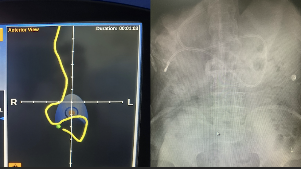 冯果医生仔细了解了患者的病情,浏览了CT图像,并向影像科郑薇医生请教阅片,反复确定胃、幽门、十二指肠的走形,当日上午便为患者在磁导航引导下置入鼻空肠管。由于准备工作充分,只花了不到10分钟便顺利将导管置入空肠段,置入深度110厘米。