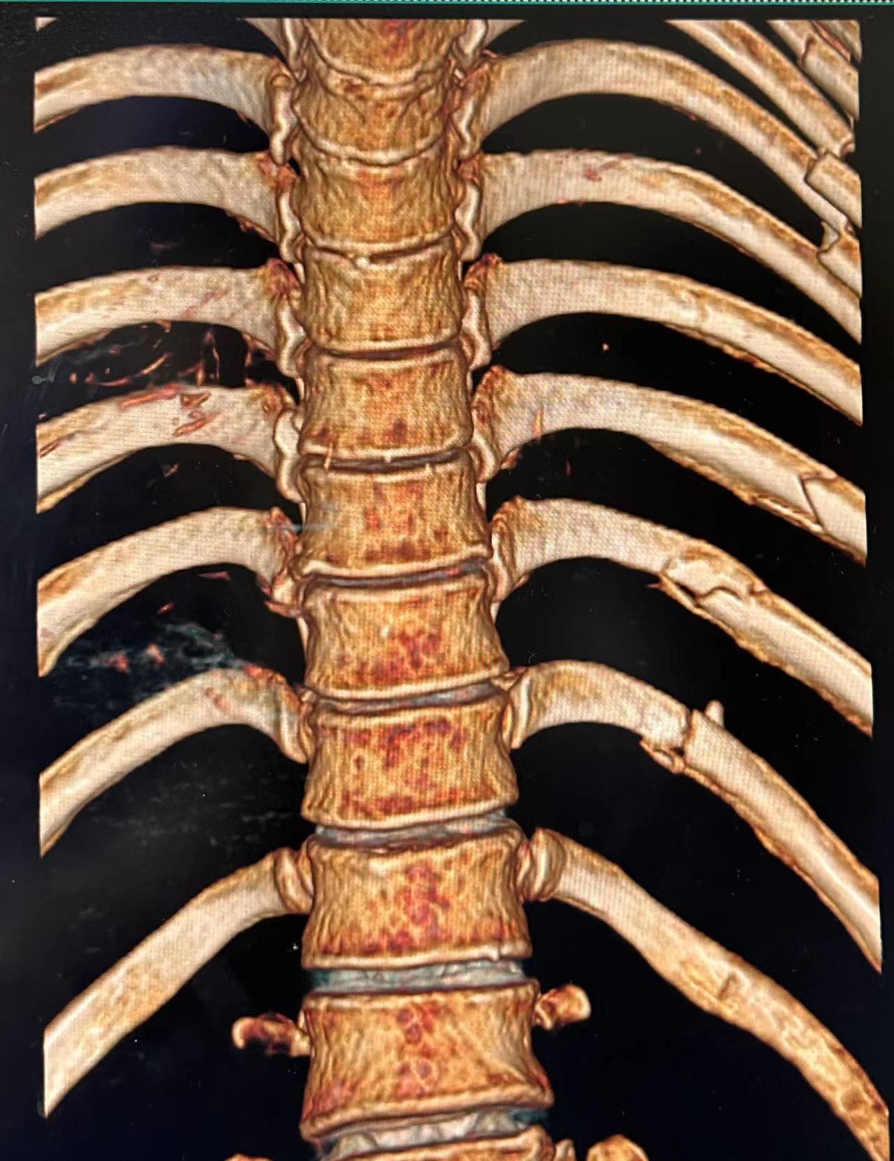 近日,心胸外科团队为一例从树上摔落的胸部外伤重症患者实施膈肌破裂修补+肋骨骨折开放复位内固定术,术后两周做胸部CT显示肋骨骨折断端固定愈合良好。目前患者正处于康复中。
