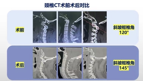 10月13日,由邓幼文、李劲松及王剑龙组成的手术医生团队,成功为罗大爷实施了“后入路枕颈融合+寰枢侧块间隙松解+寰椎后弓切除+取髂骨及枢椎棘突骨植骨融合术”。术者采用颈椎后路松解的方式,使侧块间隙分离达到9mm,再利用钉板系统强大的复位能力,斜坡枢椎角较术前增大25°,延髓腹侧压迫基本解除。随着寰椎后弓切除,枕骨相对水平化,小脑扁桃体下疝明显改善,圆满地完成了手术。术后经过一周的康复训练,目前罗大爷四肢乏力、行走不稳的症状得到明显改善。