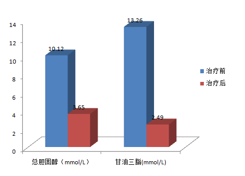 在血液净化中心王建文主任安排下,护士长申丽君带领护理团队充分准备,通过穿刺周围静脉,避免置管带来较大的创伤,经过3小时的治疗顺利下机,治疗过程中无特殊不适。患者治疗结束后立即告诉医生“自觉全身轻松、精神体力改善,感觉自己的血流速度明显加快了很多”。治疗后复查血脂指标,总胆固醇由治疗前10.12mmol/L降至3.65mmol/L,甘油三脂由治疗前13.26mmol/L降至2.49mmol/L,均显示良好的清除效果。