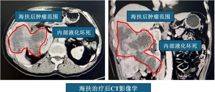 12月16日完成无创海扶治疗后,许先生的腹痛症状已经得到一定缓解。更令人欣喜的是,CT复查结果显示,肿瘤内部已经大部分出现液化、坏死,肿瘤的整体侵犯及浸润情况也较术前得到改善。海扶治疗的结果,也给孙吉春副主任医师团队在根治性手术方面带来了巨大的信心。