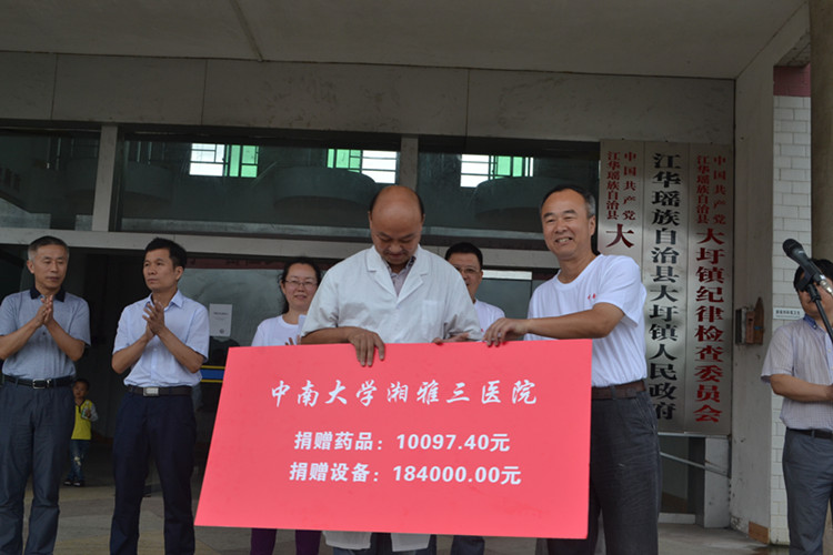 10日,“留住乡愁·中南‘同心’”公益活动启动仪式在江华大圩镇政府门前广场举行,中南大学党委副书记、纪委书记李亮讲话,校统战部部长龙大为主持,湘雅三医院党委副书记邓云龙代表我院向江华县大圩镇卫生院捐赠了价值18万余元的医疗设备和1万余元的药品。学校米莉教授介绍了“瑶族语言文化抢救与保护”项目,中南大学统一战线代表、瑶族学生共计50余人参加。