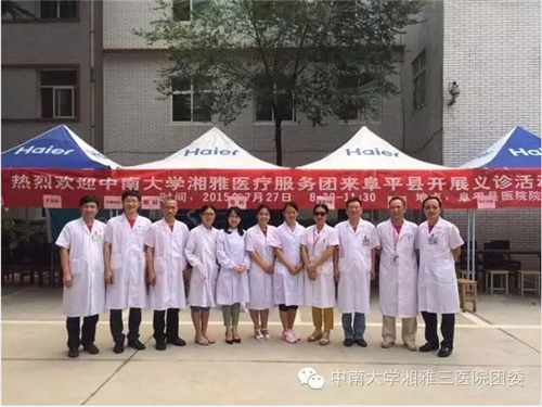 7月27日,中南大学党委高文兵书记、高山副书记亲自带领志愿服务团队赴河北阜平开展科技、医疗、教育、文艺“四进阜平”志愿服务活动。湘雅党员博士医疗服务团在阜平县人民医院举办大型医疗义诊、免费送医送药、医疗技能培训等服务活动,吸引了一大批患者前来问诊。湘雅三医院宋治教授、贺广湘教授、刘豫副教授作为服务团主要成员参与了该项活动,得到了当地群众的一致好评。