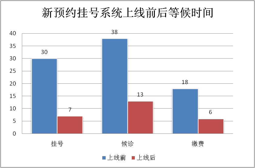 随机调取7月份来我院门诊就诊的10000个病人,比较新预约挂号系统上线后,病人挂号、候诊、缴费的等候时间。从结果分析中明显得出,新预约挂号系统上线后,挂号、候诊、缴费时间得到了有效的缩短。其中以挂号等候时间减少最为明显,从以前的30分钟,减少到7分钟,减少了76.67%等候时间。候诊和缴费依次减少了65.79%和66.67%等候时间。新预约挂号系统减少了患者的等候时间,缓解了“三长一短”问题,相对延长了患者的问诊时间。