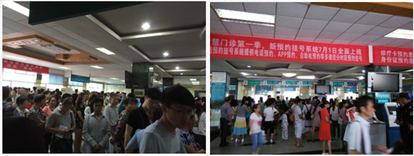 预约挂号系统上线前后早8:00门诊大厅,左图为上线前,右图为上线后。