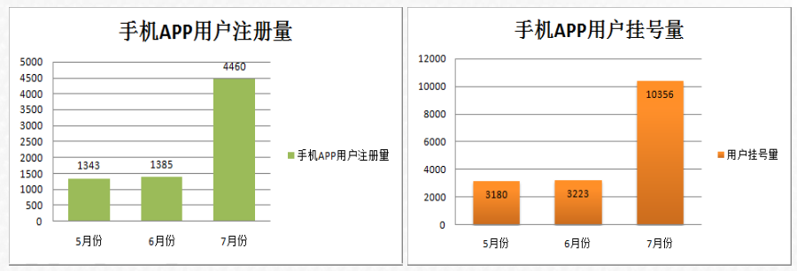 截止2015年7月31日统计,目前在册用户为12000人,其中仅7月新增注册4460人次,同比6月用户注册量增长了222%。而7月份“湘雅三e院”手机APP挂号量为10356,同比6月手机挂号量增长了221%。