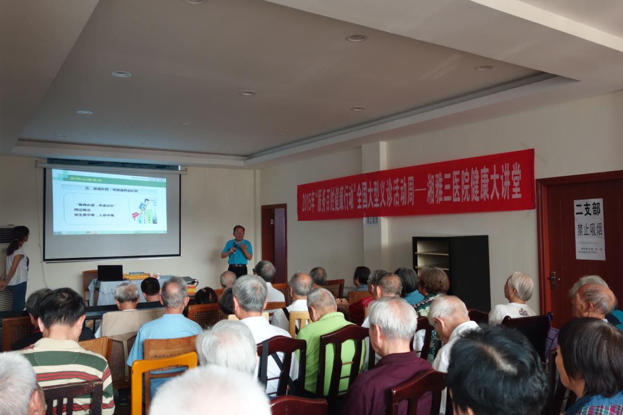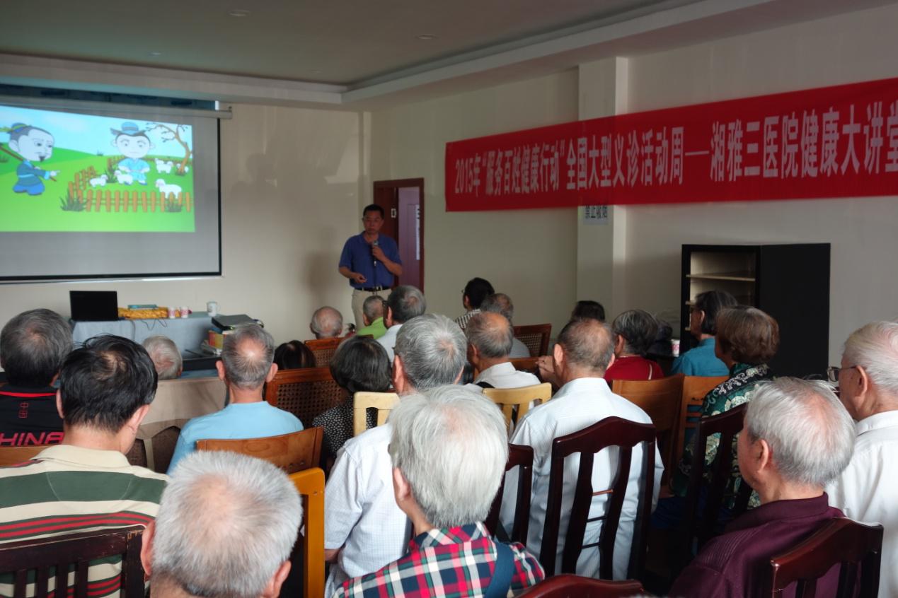 继武警某中队湘雅三医院健康大讲堂后,9月16日上午,我院门诊部组建医疗团队又奔赴湖南冶金行业离退休人员管理服务和后勤保障中心开展了专门针对老年人的健康讲座。