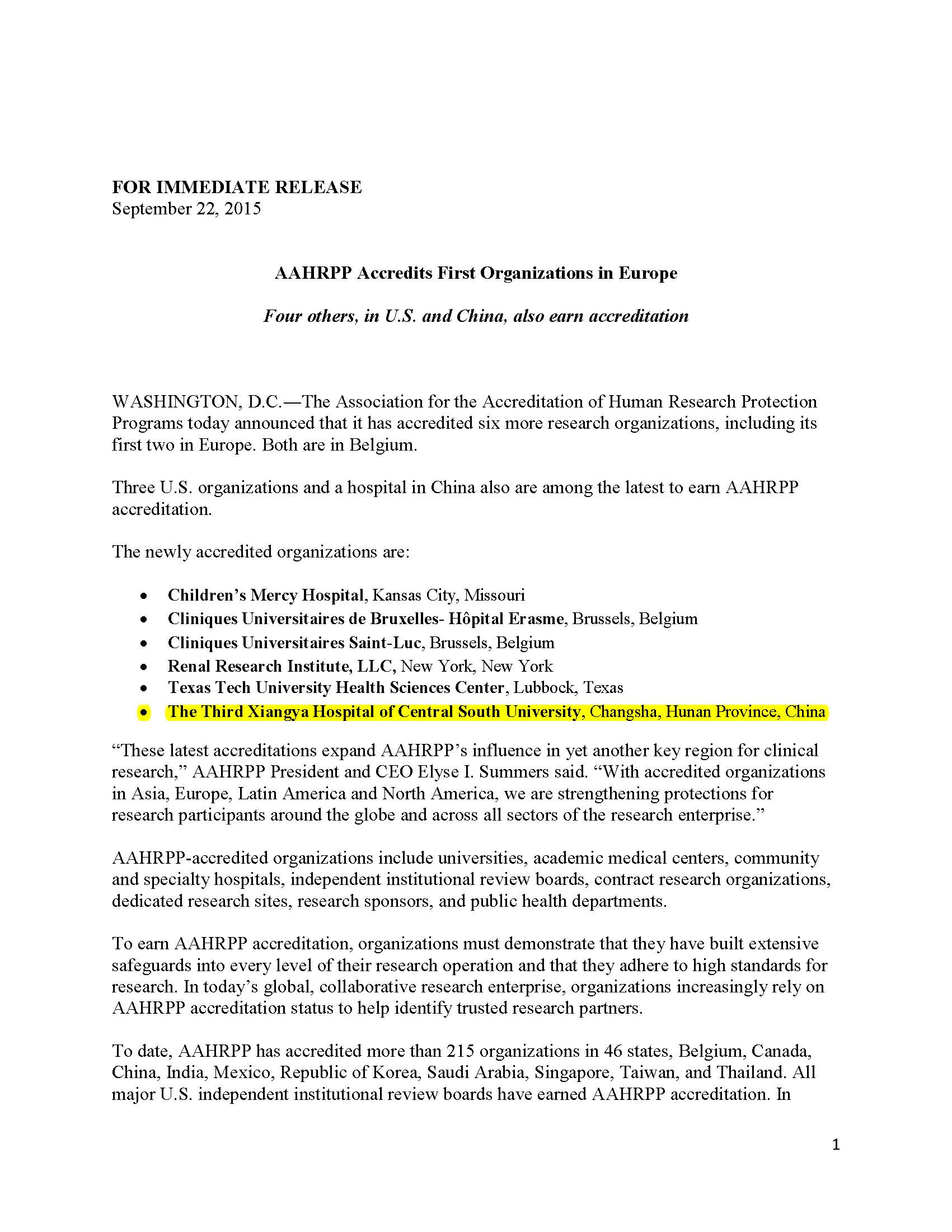 9月22日,美国人体研究保护体系认证协会(AAHRPP)总部正式公布,中南大学湘雅三医院获得了该体系最高级别认证“Full Accreditation”,有效期3年。我院成为中国大陆第2家拿到该认证资质的综合性三甲医院。