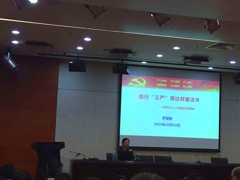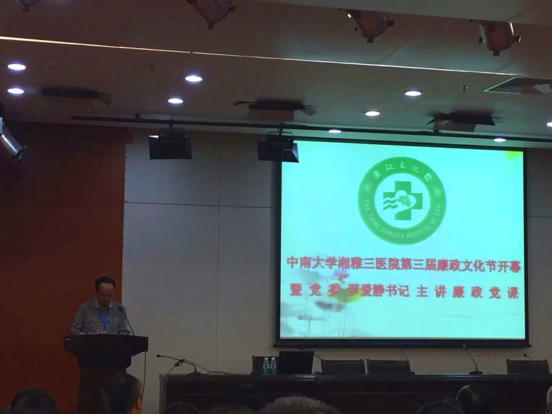 10月14日晚上,湘雅三医院第三届廉政文化节启动仪式在外科楼二楼举行,院领导罗爱静、陈方平、吴希林、朱晒红、邓云龙、杨飞龙和医院部分历任院领导以及各党支部参加了启动仪式,并认真聆听党委书记罗爱静主讲廉政党课《践行“三严”须过好廉洁关》。