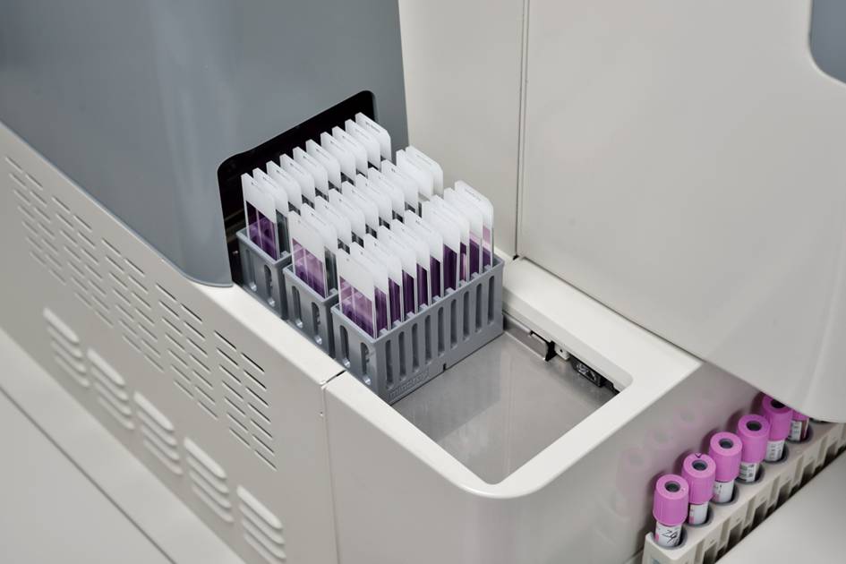 Mindray CAL 8000流水线系统由五分类血液细胞分析仪、SC-120全自动推片染色机、轨道系统以及控制系统4部分组成。五分类血液细胞分析仪采用SF-Cube细胞三维分析技术,可显著提高仪器对幼稚细胞和异常细胞的筛查、对血小板凝集的判断甚至对疟原虫感染指标的检测效率。SC-120推片染色机采用标准化工作流程,以血液粘稠度作为推片规则,降低了使用成本。先进的双轨道设计实现了标本的“三级复测”功能。