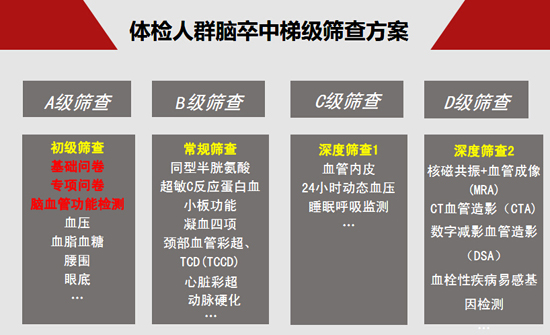 而湘雅三医院健康管理中心的当家人陈志恒则重点阐述了体检人群的脑卒中早期风险筛查和管理。提出在体检中进行“梯级筛查”(见下图)是脑卒中早期筛查的基本原则,对卒中风险进行分层管理是管理核心,而体检后的跟踪随访是风险管理的关键所在。