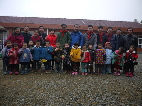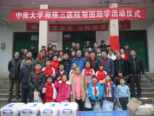 石门县是国家武陵山片区扶贫攻坚重点县和湖南省扶贫开发重点县,大山深处恶劣的自然条件成了阻碍孩子们健康成长的“梦魇”。再次走访二房坪村9岁小朋友陈加杰时,其贫寒的家庭状况令新老助学成员唏嘘不已,破败的土砖房摇摇欲坠,因为贫穷,小加杰的重庆籍母亲在他2岁多时即离他们而去,72岁的爷爷陈儒元患有严重的白内障,71岁的奶奶陈桃如和小加杰都视力严重低下,全家靠44岁的父亲一人在广东打零工维持生活。经全国先进工作者、全国劳动模范、湖南省人大代表、石门县新关镇人大原主席陈建教牵线搭桥,由二房坪完小推荐的马金伶、田绍明、陈梦玲、覃玮、覃慧丽、覃玲玲、覃涵薇、龚盈盈、魏钢志、陈加杰、田盛杨、江陈波、张杰等13位贫困家庭孩子,得到了中南大学湘雅三医院输血科的积极响应,科主任桂嵘在外开会情况下再三叮嘱李国才、张军华等5位年轻老师再次去和小朋友们会面交流,赶在寒假前专程看望大山深处的孩子们。