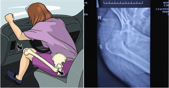 (左图:车祸致髋关节后脱位示意图;右图:该患者髋关节脱位X-ray)