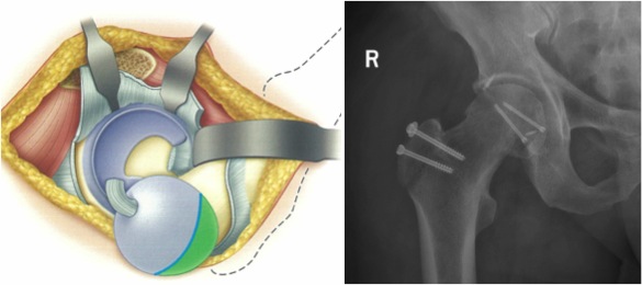 (左图:手术示意图;右图:术后X-ray显示髋关节及骨折复位效果极佳)
