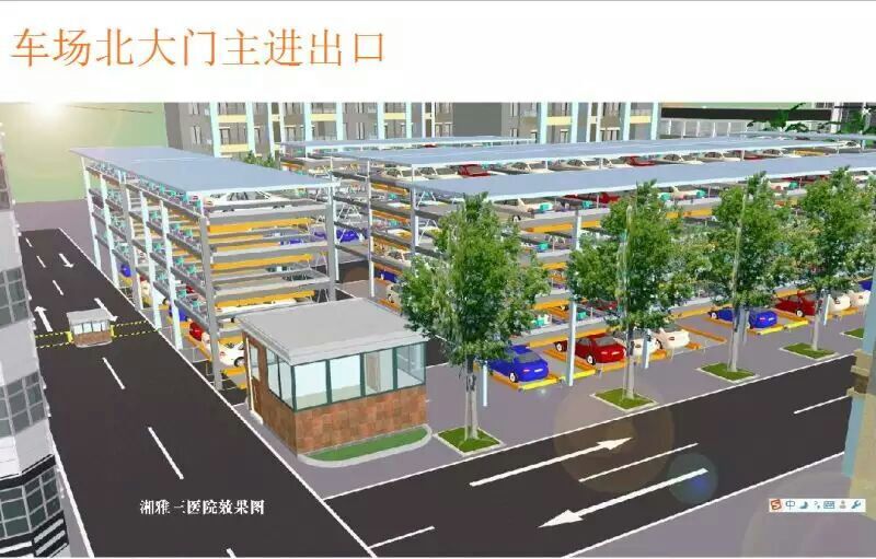 我院立体车库8月8日开始动工,建设投入资金约1200万元,建设车位400个。经过近4个多月的紧张施工,共外运渣土5000立方米,并积极与长沙市政府、长沙市交警支队、岳麓区政府及市政、城管、园林等各级政府部门的工作协调,完成了我院的立体车库出入新建通道报批、医院北门拓宽手续,现立体车库在银双路新开7.5米双向车辆出入通道一个,医院北门由原4米拓宽至9米双向车辆出入通道;移植绿化树木3棵,移位太阳能路灯2根,移位改造大门柱4个,人行道下沉改造等,更美观更方便地与银双路连接。