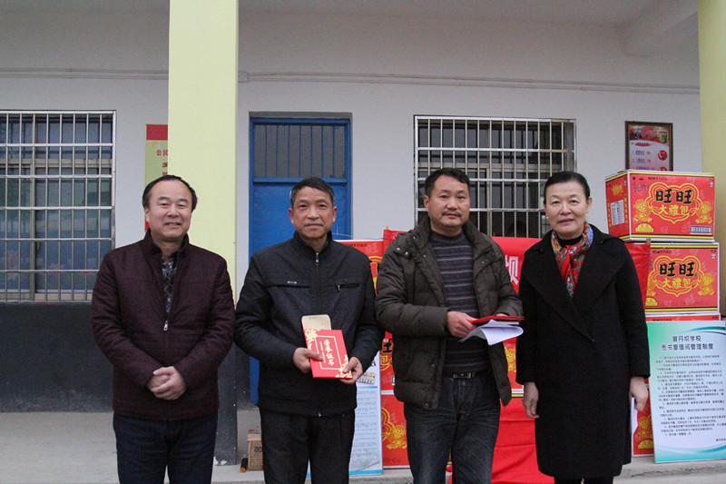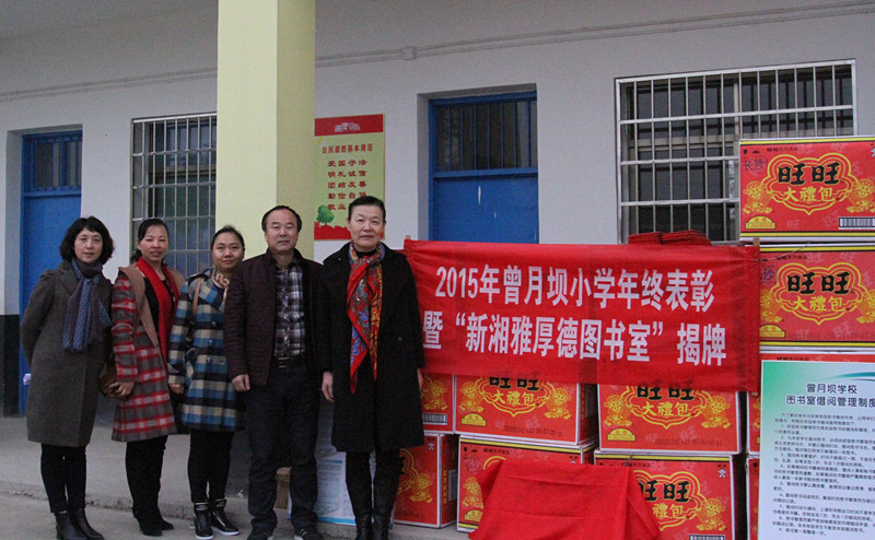 湘雅三医院党委副书记兼工会主席邓云龙、妇科主任薛敏为2015年度曾月坝小学优秀教师、优秀学生颁发奖状、奖金,予以鼓励,共同为“新湘雅厚德图书室”揭牌,并向校方派送春节慰问物资。