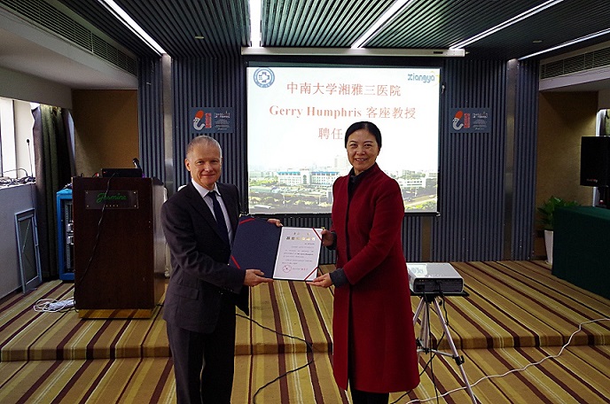 1月8日下午,英国圣安德鲁斯大学Gerry Humphris教授受聘为中南大学湘雅三医院客座教授。党委书记罗爱静为Gerry教授颁发聘书,党委副书记邓云龙、ICU主任杨明施及相关临床科室医护人员20余人参加了会议。聘任仪式由国际合作与交流部主任刘新春主持。