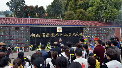 3月29日上午,湖南省红十字会、湖南省卫生计划生育委员会在长沙凤凰山遗爱人间公益陵园共同举办了以“爱,让生命延续”为主题的大型清明缅怀祭扫活动,志愿者、部分捐献者家属和器官捐献工作人员240余人献上鲜花,缅怀长眠在此的260位遗体器官捐献者。