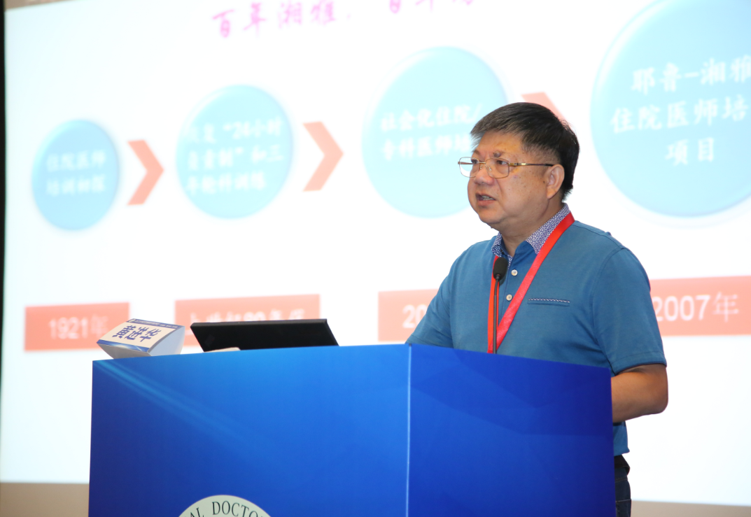 会上,皮肤科专家黄进华教授以“耶鲁-湘雅住院医师六大核心能力培养模式探索与实践”为题进行了专题汇报。黄教授结合医院发展经历,声情并茂地讲述了湘雅三医院住院医师规范化培训的发展历程。他指出,住院医师培训工作应紧紧围绕学员的六大核心能力来开展,六架马车齐驱并进,不应有短板,方能培育出合格的医师。优秀的医师的培养不仅要注重“三基三严”功底的规范,而且要重视创新能力,对于“高尚的职业素养”的追求也应贯穿于培养过程的始终。