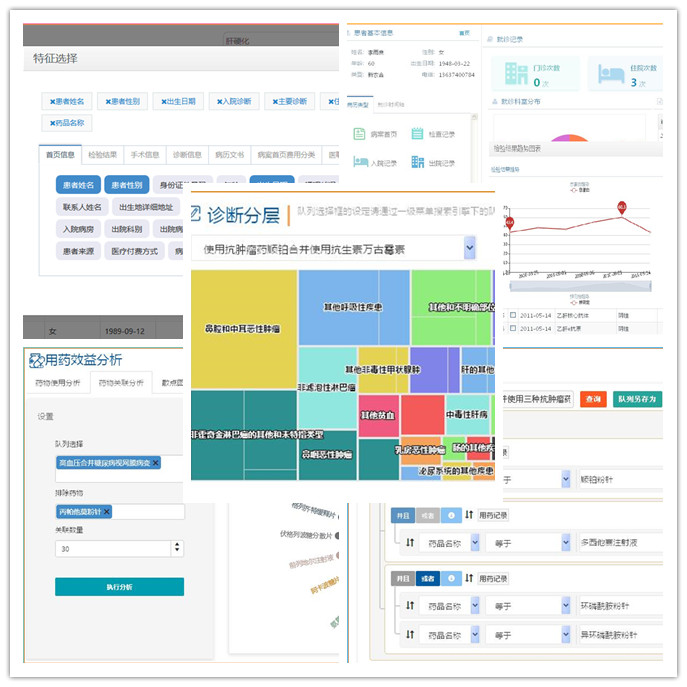 在“新理念”和“新技术”的基础之上,湘雅三医院临床大数据中心实现更加贴近临床、贴近管理、贴近科研的“新应用”。基于临床数据中心的应用共享平台具有六大特色,第一、七大检索体系,现已完成7大检索体系,即:湘雅易搜、队列多维度检索、手术检索、用药检索、检查检索、诊断检索、队列发现。临床医生可自定义配置检索条件,浏览不同层面检索数据结果。可在海量数据中“秒速”查找疑难病例、相似病例,应用于疑难病例讨论,参考既往病例治疗手段,提高临床诊疗效果。第二、数据来源多样化,2种数据类别,可多维度组合条件检索。第三、检索结果交错性增加,入院基本信息、生命体征、化验结果等检索结果可在一张表单中呈现,实现患者全景360视图。第四、安全级别提升,采用三库分离方式,CDR所有数据都从 中间库取数。所有临床统计需求,都从临床数据中心(CDR)取数据,并且采用患者隐私数据加密和脱敏技术,确保数据安全性和业务系统正常运行。第五、各类技术支撑智能决策体系,通过桑基图、症状图谱、词云、聚类分析、诊断分层、Drug Era和和弦图等全方位实现慢病管理、疾病防治-流行病预测、药物研究与评估、疾病诊断与筛查、运营优化、医疗质量监管,提高医疗服务质量,实现减少医疗差错、降低医疗费用、提高患者满意度。第六、直接嵌入业务生成系统的用药辅助决策,以临床问题列表为知识代理,根据临床数据自动推荐诊疗协议,查看与临床相关的循证文献,提供个性化临床决策支持。除此之外,原创专病或管理大数据系统:高血压、糖尿病、护理管理、急救创伤、健康管理等功能。可利用专病CDR功能,建立疾疾病风险预测模型,知识库功能对队列数据进行探索分析,旨在提高医院科研生产力,将科研成果转化为知识。