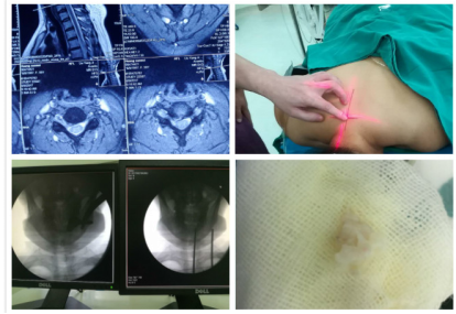 入院后,在黄东教授主持下进行术前讨论,详细分析了患者病史、体征及辅助检查结果,主要是C5/6椎间盘突出压迫右侧C6神经根引起的脊神经根性症状,颈椎间盘突出(C5/6)诊断明确。考虑到患者病程长,突出物较大,疼痛明显,严重影响患者生活质量,且患者拒绝行开放手术治疗,而射频、激光等微创治疗疗效不确切,故考虑行颈椎间孔镜手术。