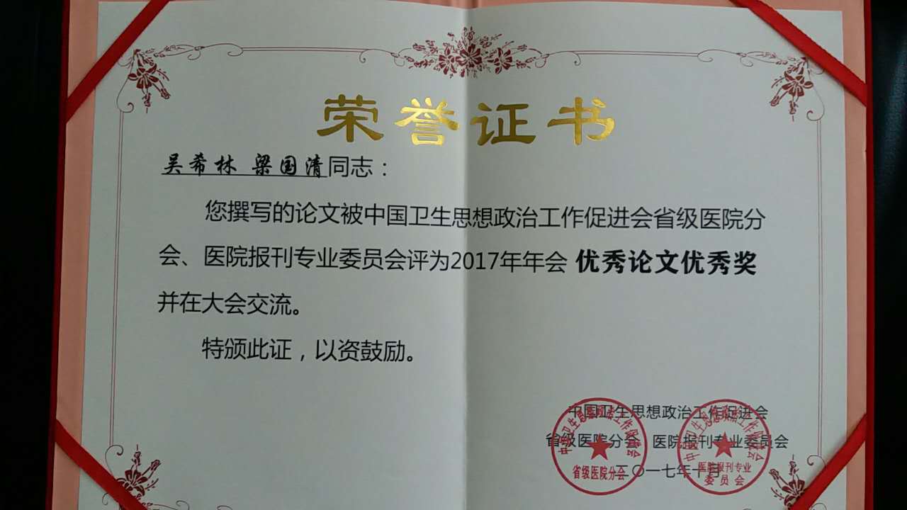 会议期间,对2016年度宣传工作先进集体、先进个人及优秀论文进行了表彰。中南大学湘雅三医院荣获全国医院报刊与新闻宣传先进集体,论文《党建引领最年轻国家队跨越发展》荣获优秀论文。