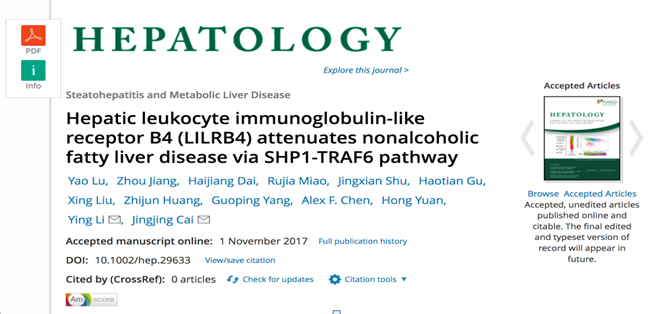 据了解,《肝脏病学》是目前国际肝脏病学领域最具影响力的权威期刊。随着肥胖及其相关代谢综合征全球化的流行,非酒精性脂肪性肝病(NAFLD)现已成为欧美等发达国家和我国富裕地区慢性肝病的重要病因,目前成人患病率为10%~30%;NAFLD除直接导致肝硬化外,还参与2型糖尿病和动脉硬化性心脑血管疾病的发病,已经成为是当代人类健康危害一大新的挑战。目前有关NAFLD的发生发展机制尚不十分清晰,有研究表明肝脏固有免疫参与了非酒精性脂肪肝之发生和发展的过程,而肝脏通过固有免疫细胞的激活促进炎症介质的表达及肝细胞的凋亡促进了非酒精性脂肪性肝病的病程进展。为了探讨相关发生发展机制,该青年团队围绕非酒精性脂肪肝的固有免疫机制开展相关研究,发现固有免疫体系中关键调控因子白细胞免疫球蛋白样受体B4(LILRB4) 通过激活TRAF相关通路促进肝细胞炎症反应,导致脂肪肝加重。