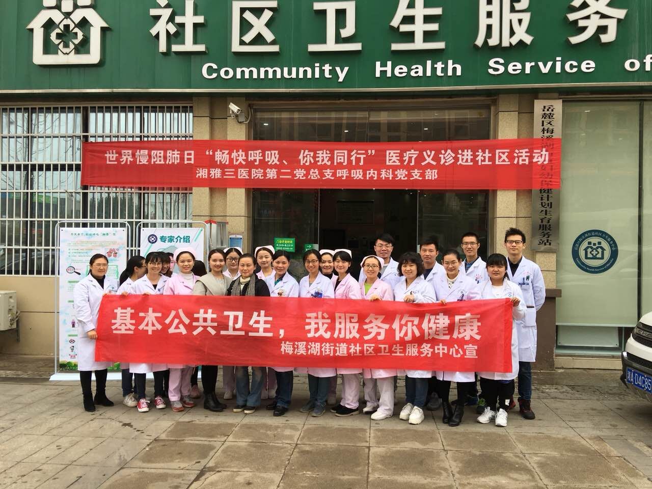 11月15日上午,湘雅三医院第二党总支呼吸内科党支部联合社会服务部一行20人来到梅溪湖街道社区举行“畅快呼吸,你我同行”义诊活动。活动响应党的“十九大”提出的“健康中国”实施战略,以第十六个“世界慢阻肺日”为契机,深入社区,开展慢阻肺筛查、慢病义诊、健康讲座等一系列活动,受到了社区居民的热烈欢迎和一致好评。