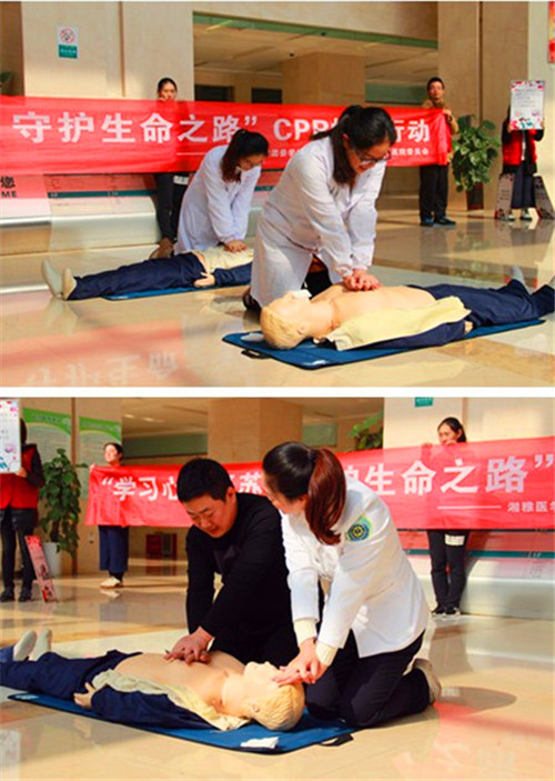 中午,湘雅医学院的同学们在外科大楼中厅上演了“CPR快闪”,同学一边向现场演示心肺复苏急救,一边用展板讲解每一步的具体要领,并向来往病友及家属详细讲解心肺复苏急救流程。