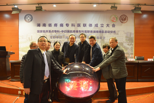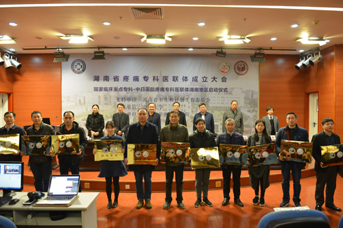 湖南省卫计委医政医管处副处长李世忠,中国疼痛学会候任主任委员张达颖,中日医院疼痛科副主任朱谦副教授,湘雅三医院党委书记罗爱静、院长陈方平、黄飞舟等领导与专家出席,并为协作单位和合作单位授牌。