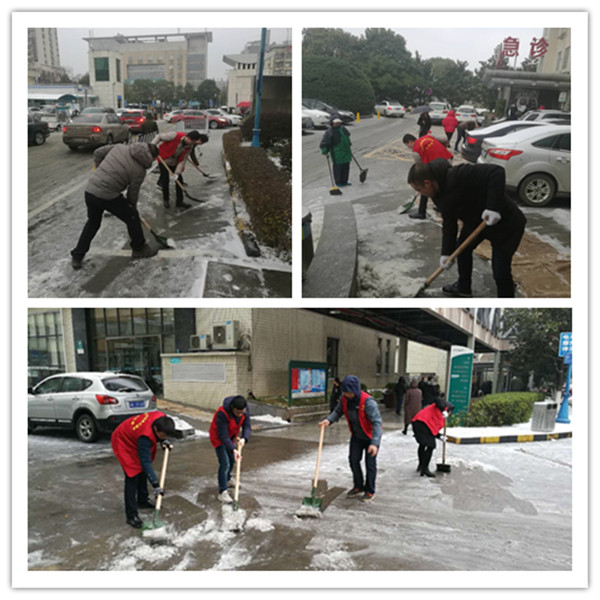 2018年1月26日,湘雅三医院迎来了入冬以来第一场大雪。上班时整个医院已经一片银装素裹,积雪给院内交通和医疗带来了不便。在院领导杨飞龙的带领下,医院各职能部门工作人员及来自全院各条战线的青年志愿者100余人对医院内的积雪进行了清除,确保患者及家属、临床一线职工安全通行。