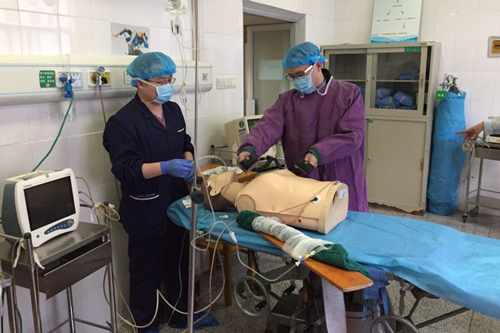 下午16:30,“2间病人情况不好,快来抢救!”随着这一声呼救,演练正式开始,气氛紧张,心脏按压、面罩给氧、气管插管、除颤、急救药品、紧急呼叫相关科室援助,所有抢救人员各司其职,医护合作协调,救治程序有条不紊,逼真地模拟了意外发生时的场景。最后几位老师们现场给予点评。