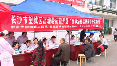 3月30日,中南大学湘雅三医院联合望城区疾病预防控治中心、高塘岭街道社区卫生服务中心开展“世界结核病防治义诊宣传活动”。呼吸内科周妍主治医生和慢病管理组小组长肖益彩护士长为首的医护团队在高塘岭街道开展义诊活动。