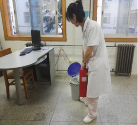 演习场景一,火势小,疏散难度小:医生突然发现诊室起火,通知护士拨打院内火警7119电话,发现火势可控,手持灭火器扑灭小火。