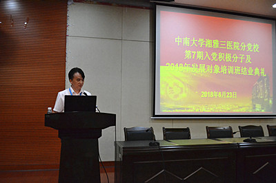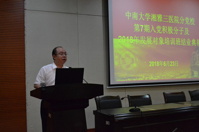 分党校副校长、医院党委副书记杨飞龙作培训班工作总结,他介绍了本期培训班的基本情况,指出培训班的特色和亮点:一是严把入党关口,突出政治标准。培训学员的确定,严格按照《中国共产党发展党员工作细则》要求,严把入党关口,突出政治标准,坚持慎重发展、均衡发展,提高发展质量;二是整合培训资源,强化学习重点。培训紧跟形势,依托新媒体技术,整合资源,创新方式,拓宽培训渠道,打造线上线下学习联动机制,并以需求为导向,突出学习重点,安排教学任务,及时将习近平新时代中国特色社会主义思想、党的十九大及全国“两会”精神进课堂,用新时期党的思想理论武装学员头脑;三是加强社会实践,端正入党动机。分党校将学员列入医院 “爱心门诊”志愿服务队,通过志愿服务方式,壮大队伍,强化实践效果,引导和激励学员践行全心全意为人民服务。