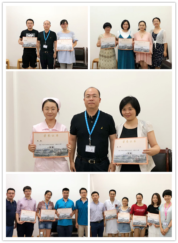 团委副书记肖睿宣读了《关于表彰“新时代·新青年·新征程”主题征文比赛优秀组织奖和优秀征文的决定》(院团字2018[4]号)。第二团支部、第九团支部获得优秀组织奖,余希、杜颖获得一等奖,黄柯、朱素翠、李姿萱获得二等奖,陈娟、周艺津、程海威获得三等奖,郑世琛等6人获得优秀奖。医院党委副书记、纪委书记张劲强,全体团委委员分别为受表彰的先进集体和获奖个人代表颁奖。