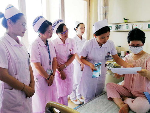 在教研室易琦峰副主任精彩的开场发言后,护理查房拉开了帷幕。在王玲护士长及总带教余隽老师的指导下,九名同学分工明确,共同协作,默契配合。来自湘南学院的小组长王滢负责主持,按照护理程序分别从护理评估、护理诊断、护理措施及护理评价各方面进行了汇报。本科生李琦、祝晴及研究生潘思分别在病人床旁进行了体格检查、随访指导及健康宣教,并展示了科室制作的实用性乳腺癌术后康复操。研究生孟婧婧联系患者了解病情,以提问形式带领大家回顾了三阴性乳腺癌基本知识,与现场同学互动频频,气氛热烈。研究生陈明珠就该患者目前治疗方案,简明扼要地介绍目前国际上三阴性乳腺癌最前沿的治疗进展,大家兴致勃勃,听得很认真。
