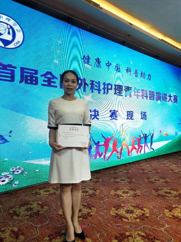7月25日-28日,由中华护理学会外科专委员会青年委员会举办的“健康中国,科普助力——首届全国外科护理青年科普演讲赛”在吉林长春顺利举行。我院骨科26病区教学骨干王莹在全国参赛选手中通过层层筛选,在现场预、决赛中脱颖而出,斩获“全国十佳”及最佳人气奖。