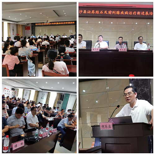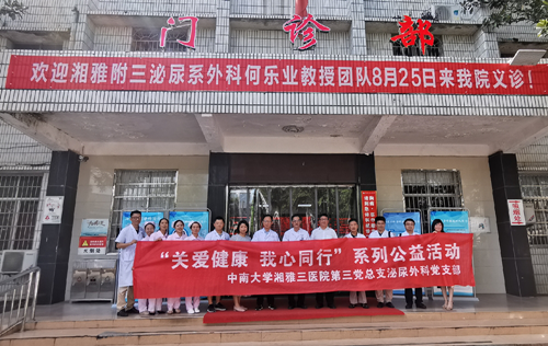 8月25日,为庆祝第二个中国医师节,深刻领会“不忘初心,牢记使命”主题教育的重大意义,中南大学湘雅三医院党委副书记杨飞龙、第三党总支书记朱锐、泌尿外科党支部书记何乐业带领泌尿外科支部党员组成的专家志愿服务队一行14人,来到长沙县第二人民医院举行“关爱健康,我心同行”系列公益活动。活动分为两个部分,包括专家团受邀在长沙县泌尿结石及前列腺疾病治疗新进展培训会上授课和为当地群众健康义诊。