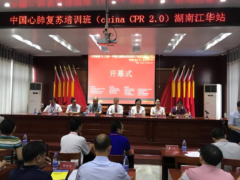 8月24日,在“健康中国”战略方针指引下,为响应党中央精准扶贫号召,落实国务院颁发的“健康中国行动计划”,由中国心肺复苏培训专家委员会、中南大学湘雅三医院中国心肺复苏培训中心、湘雅三医院医务部对口支援办公室主办,江华县人民医院承办的中国心肺复苏培训(China CPR 2.0)基层班(湖南江华站)暨“民健康‘心’行动”精准扶贫项目在江华县人民医院如期开幕。中国研究型医院学会心肺复苏专委会主任委员王立祥,副主任委员张玉想,湖南省心肺复苏培训专委会副主任委员,湘雅三医院急诊科主任张天一,江华县人民医院院长李昌江及湘雅三医院急诊科心肺复苏培训导师团队出席开幕式。