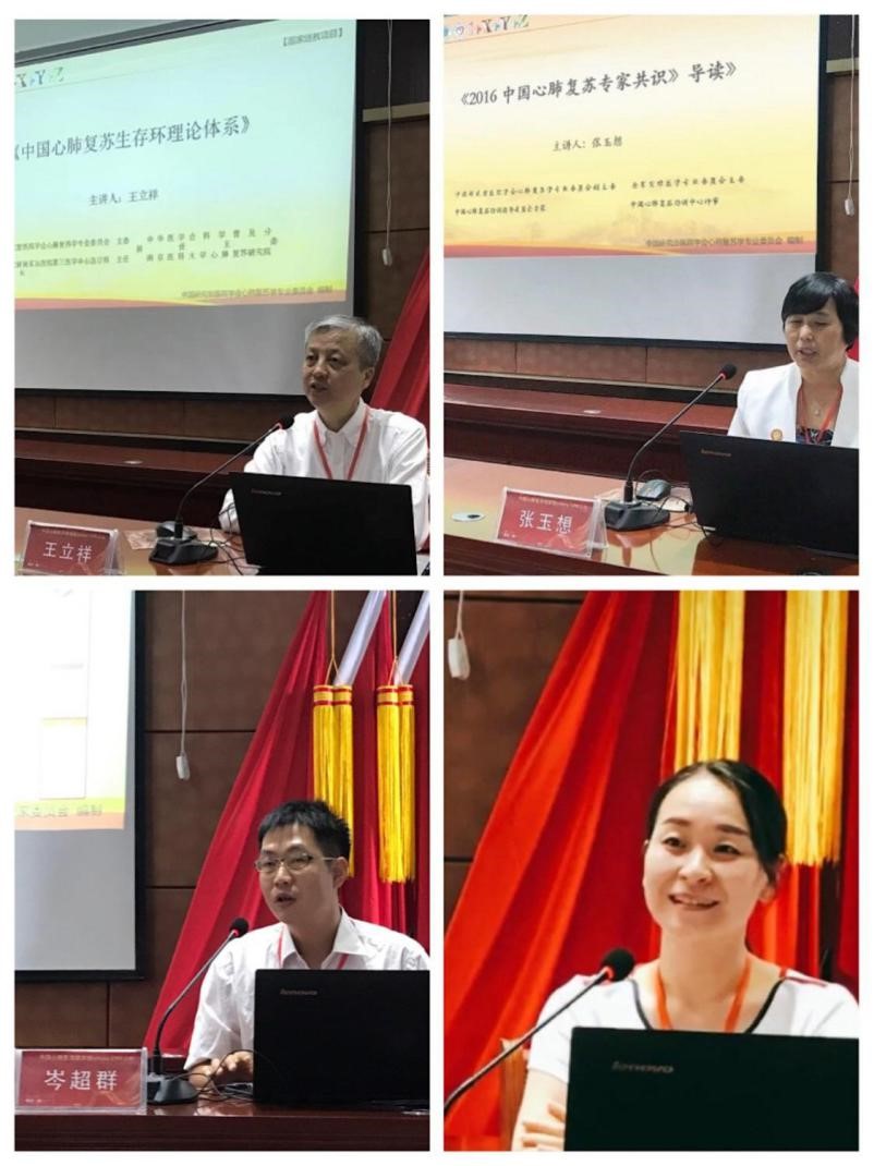 王立祥教授以《中国心肺复苏生存环理论体系》、《中国腹部心肺复苏专家共识导读》作理论授课;张玉想教授对《2016 中国心肺复苏专家共识》进行了详细解读;岑超群、吴琼讲师分别讲述了《中国公民心肺复苏卫生健康指南》和《中国心肺复苏培训实操技术教学概要》。