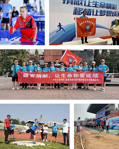 湘雅三医院移植中心主任指派移植医生朱毅、护士崔丽娜带队与16名移植受者同行参加了此次活动。这支以“器官捐献 让生命和爱延续”命名的移友代表队中有肝移植患者和肾移植患者。参赛移友年龄最大的是63岁的陈郅,今年是他肾移植术后的第27年,这支队伍的队员们平均年龄在46岁左右,其中几位老队员已经是连续四届参加全国移植病友运动会。本次运动会中来自湘雅三医院的16名移植运动员参加了田径、羽毛球、乒乓球、游泳比赛等12个项目,并取得了可喜成绩,一共斩获4枚金牌、5枚银牌和3枚铜牌。