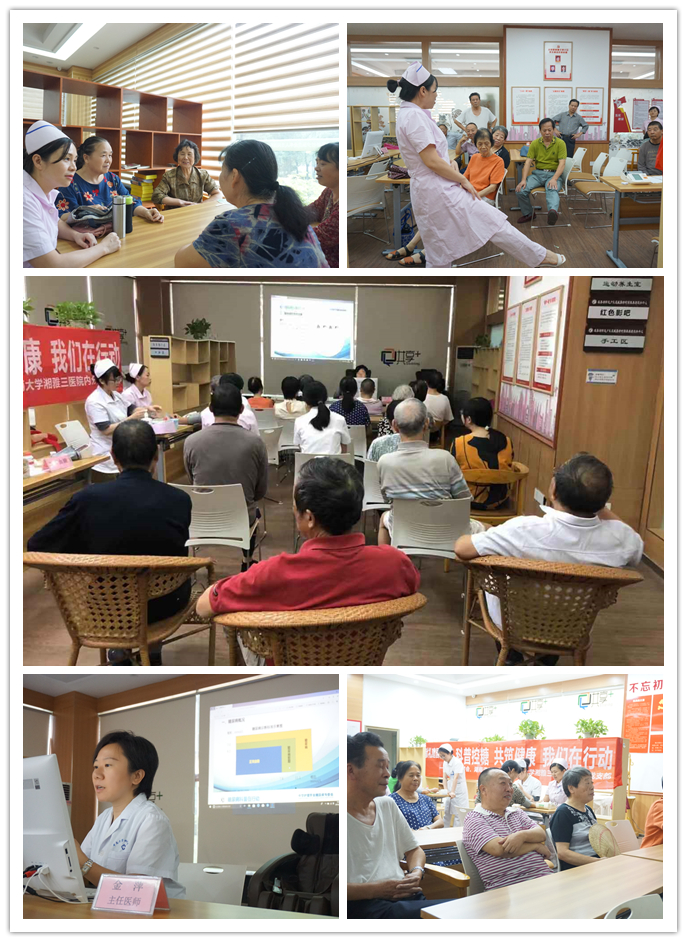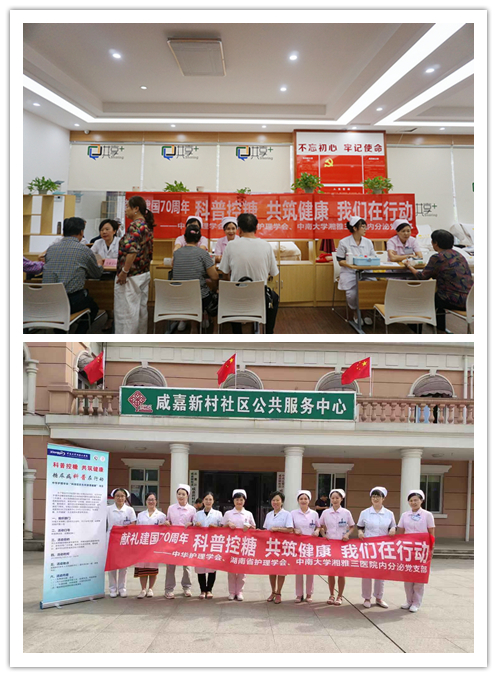 9月25日,为进一步贯彻落实《“健康中国 2030”规划纲要》,响应 2019“礼赞共和国 智慧新生活——科技促民生 科普惠健康”全国科普日主题活动及中华护理学会糖尿病护理专委会“科普控糖、共筑健康”主题科普活动的号召,湘雅三医院内分泌党支部书记龙飞艳组织本支部金萍主任医师、李霞护士长,党员肖倩、贺娟、袁晶晶、邓秋芳等医护人员及院内糖尿病护理小组相关成员来到全国文明社区咸嘉新村,开展“科普控糖、共筑健康”的主题活动。