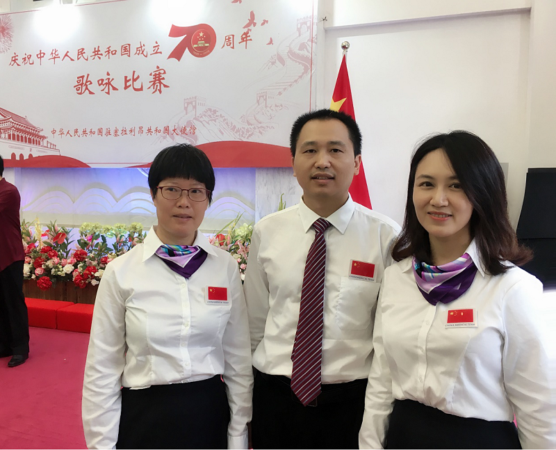 湘雅三医院三名援塞拉利昂医疗队队员罗卓琼、赵孟文和曹燕娜在塞拉利昂参加系列国庆庆典活动,以自己的方式祝福祖国70华诞。